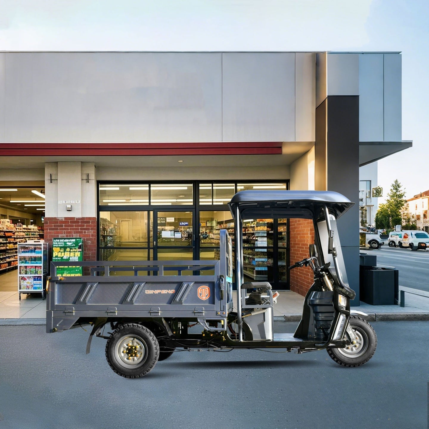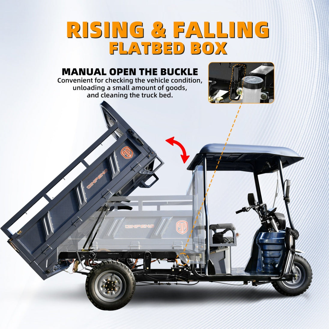 The Jinpeng 1500W Electric Cargo Tricycle Truck with Canopy (JINETHA180P) is a powerful and reliable electric cargo tricycle designed for heavy-duty hauling, commercial deliveries, and daily transportation. Powered by a robust 60V 1500W electric motor, this cargo trike delivers smooth acceleration and speeds up to 25 mph, making it ideal for warehouses, farms, businesses, and urban deliveries. With a spacious cargo bed and strong frame, it supports loads up to 1,760 lbs, providing exceptional capacity for transporting goods efficiently.
