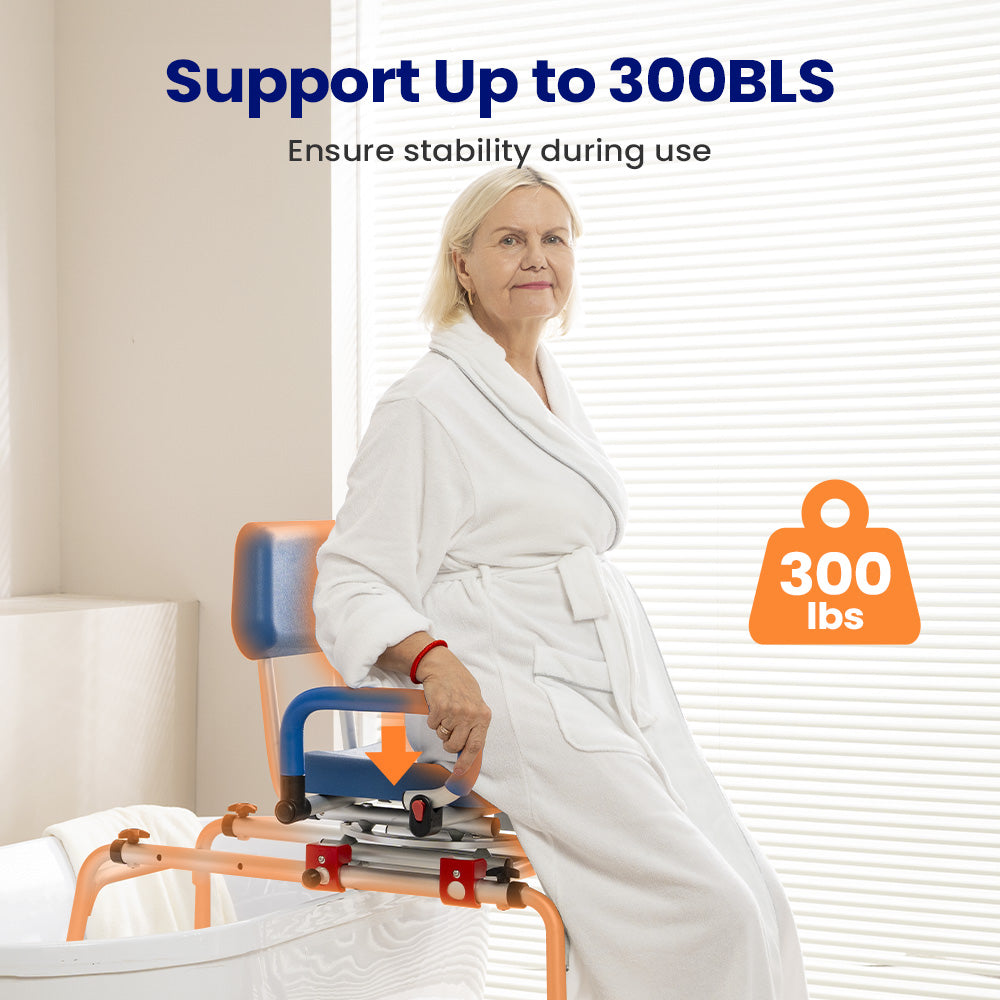 ✅ Smooth Sliding for Safer Transfers: With the simple pull of a knob, the seat smoothly slides along the rail and locks in place, helping users avoid dangerous slips and falls. Unlike traditional bath stools, this transfer bench eliminates the need for dragging, preventing skin tears, knee, and hip strain.