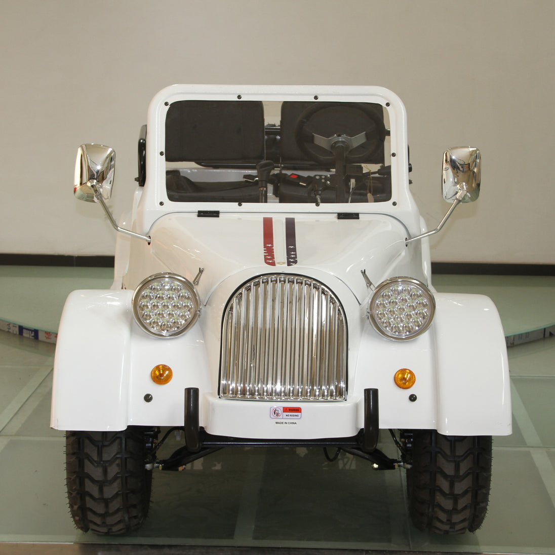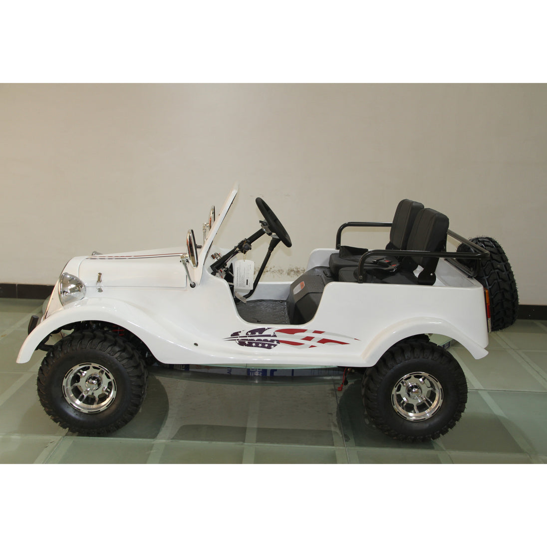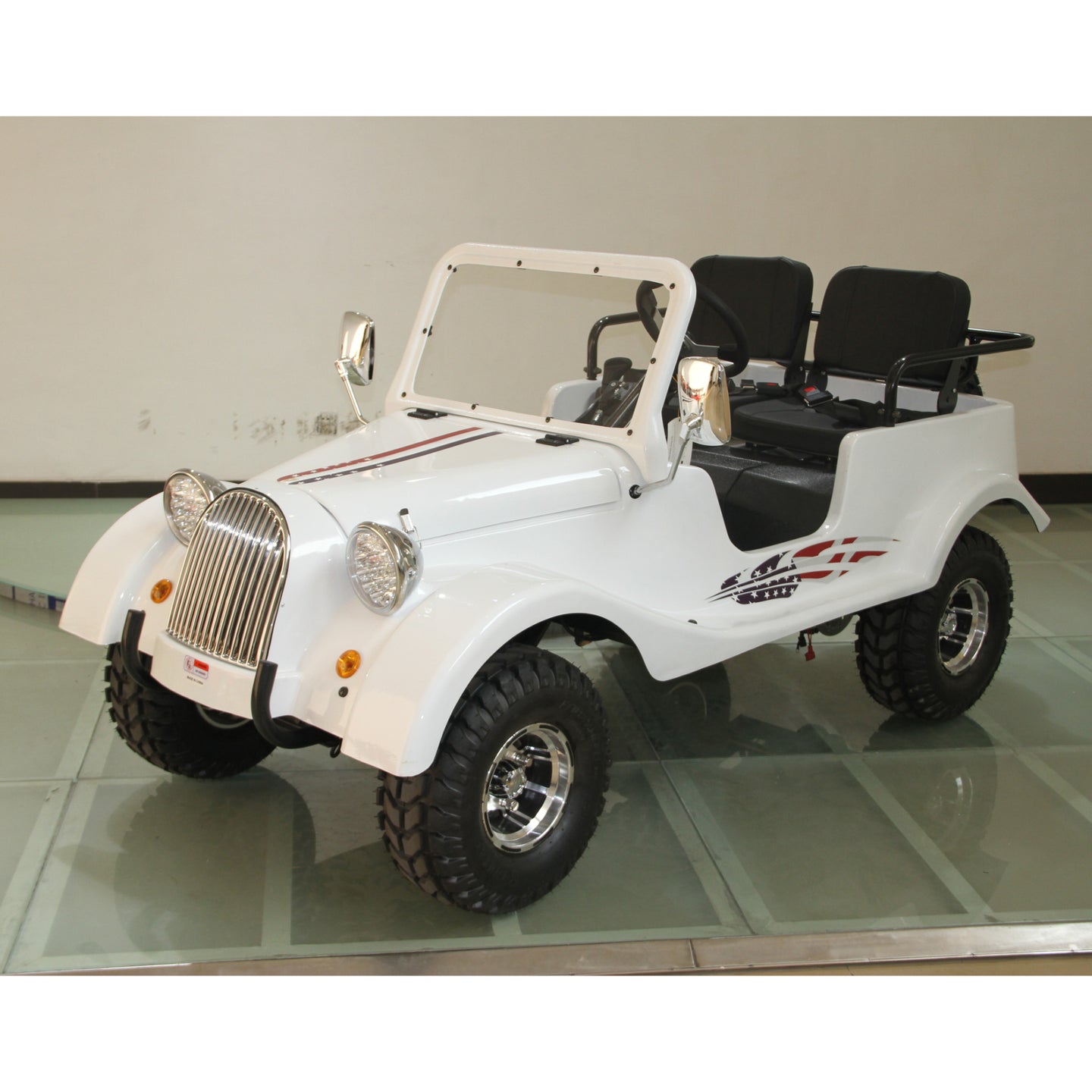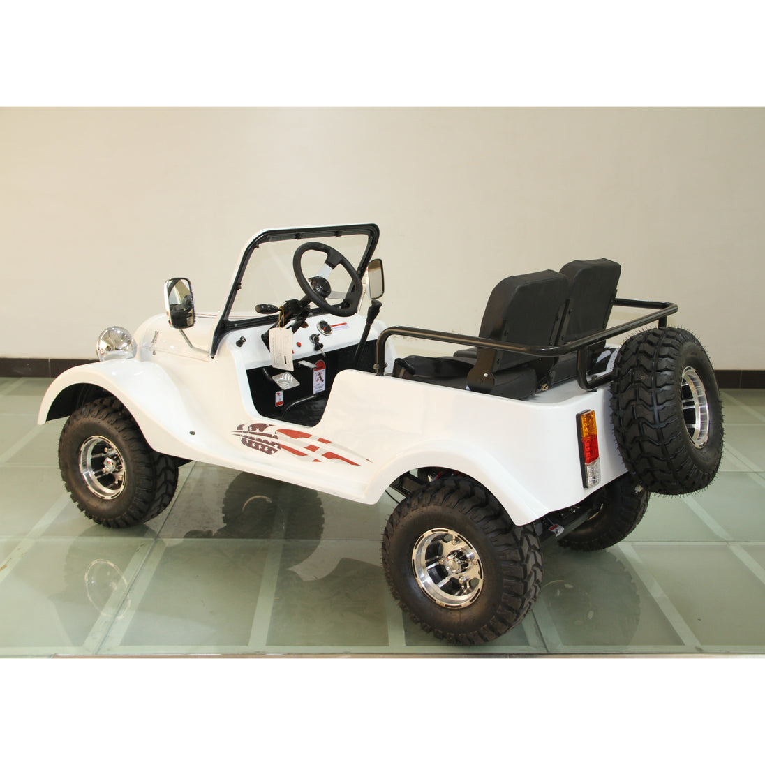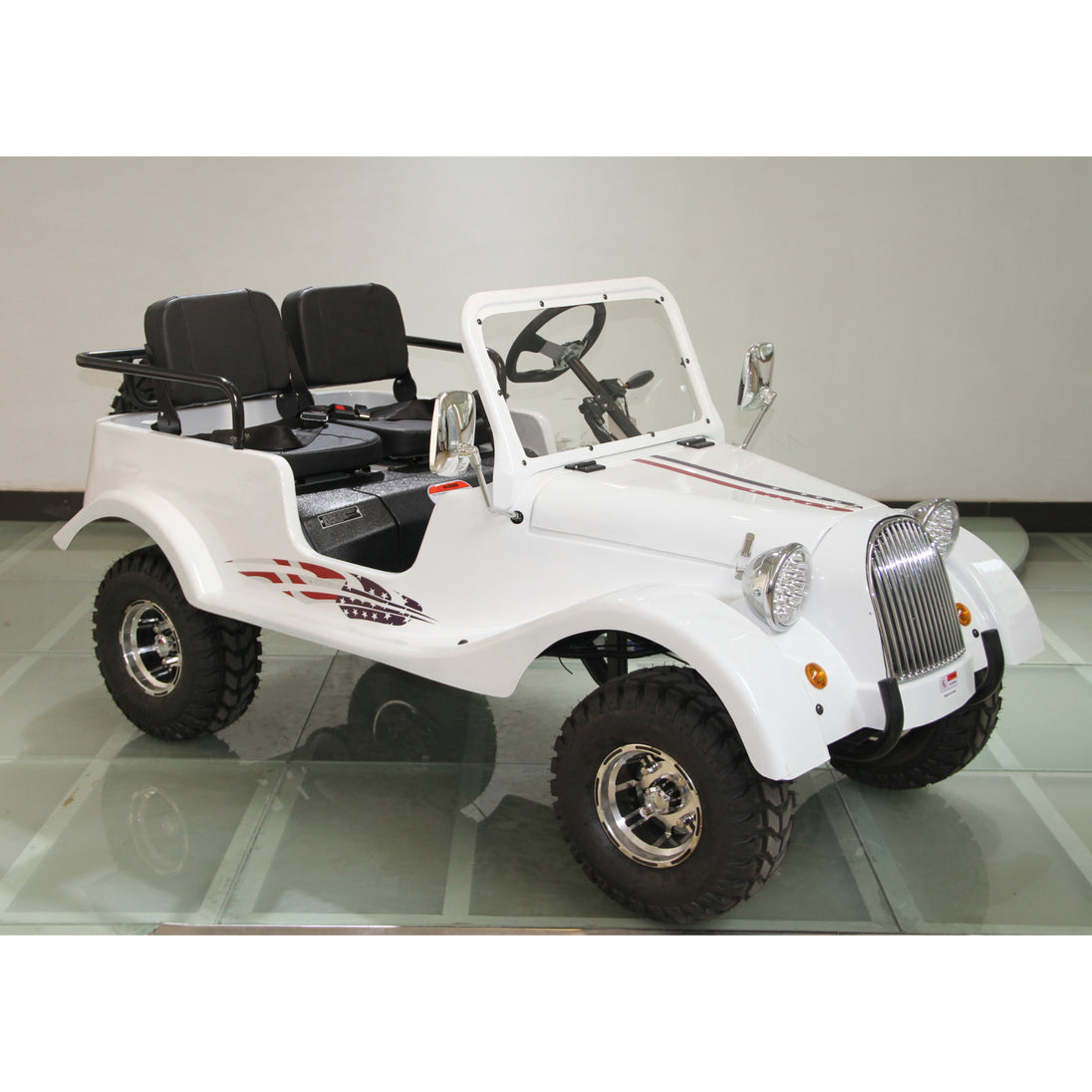 Built with a steel frame, dual A-arm suspension, and hydraulic disc brakes on both ends, this classic mini car rides with confidence and stability. With a womb-like seating position, LED headlights, and nostalgic design, it’s ideal for both recreational cruising and property touring—fun, safe, and inherently charming.