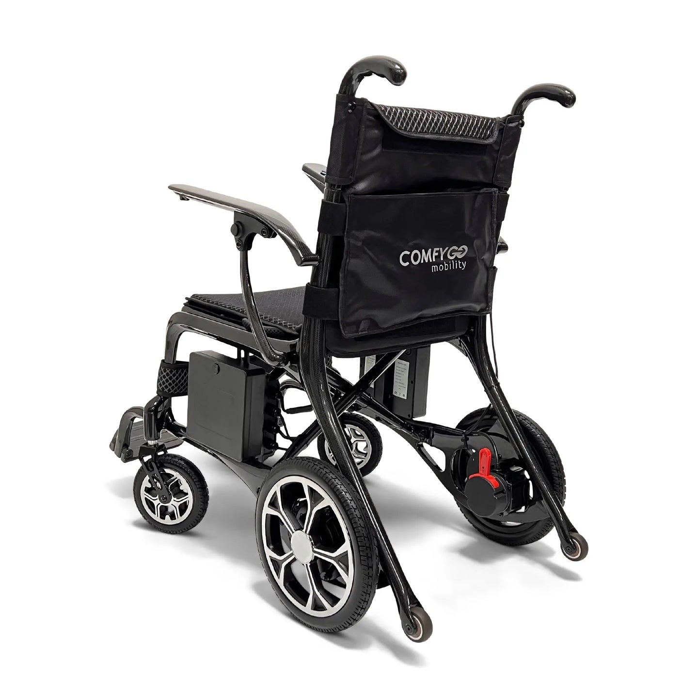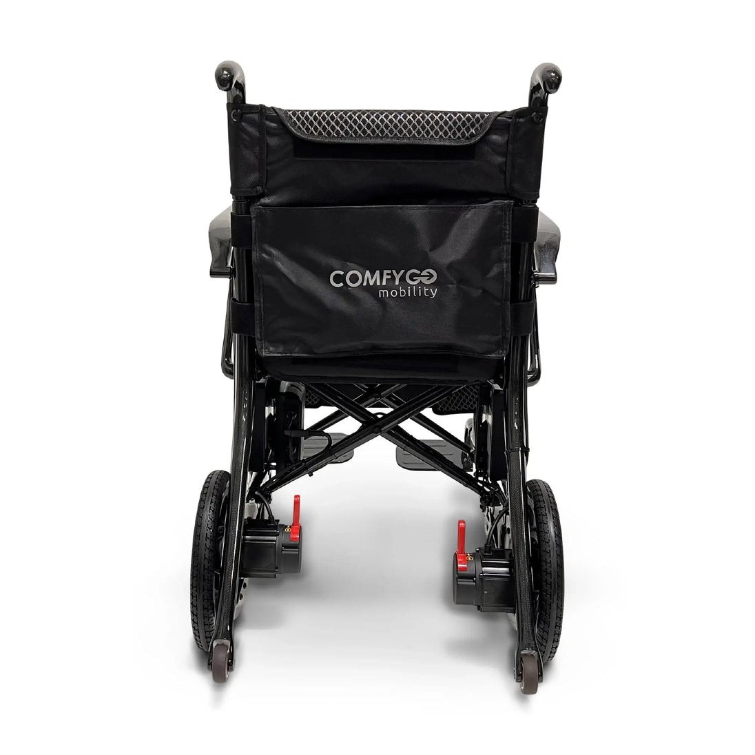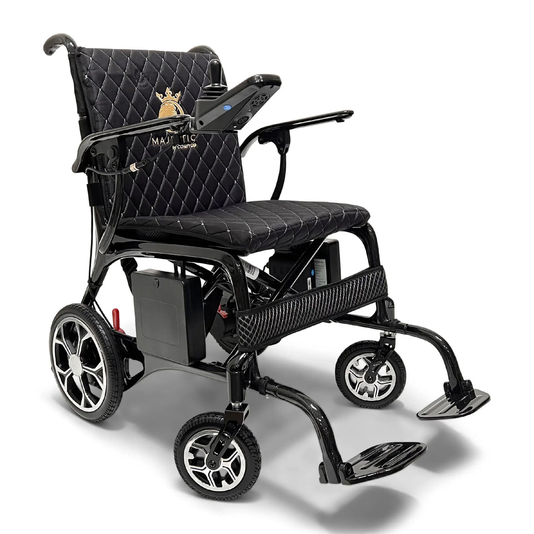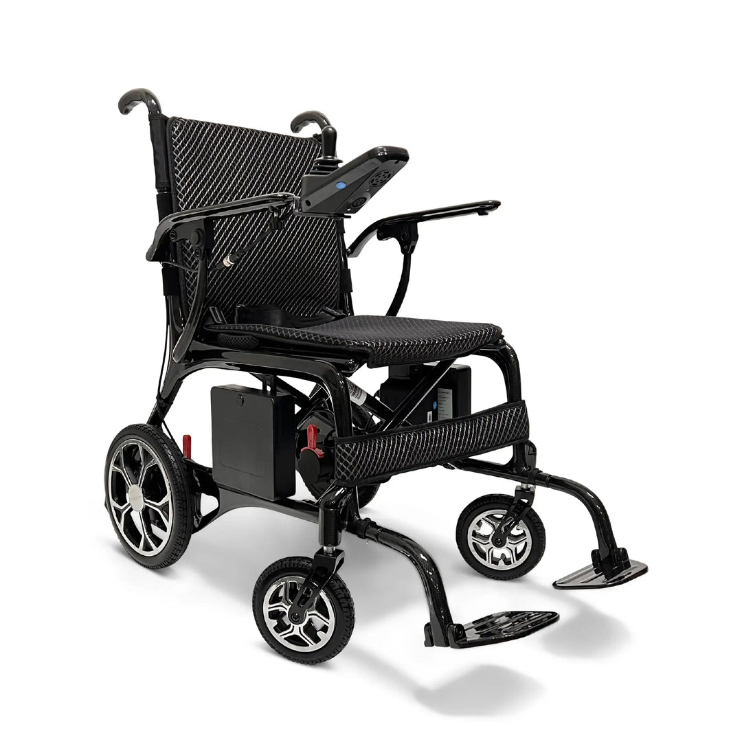 The ComfyGO Phoenix Carbon Fiber Wheelchair comes with two 6.6 AH lithium-ion batteries (standard) or two 10 AH batteries (long range). Both are quick-release, airline and cruise approved. Charging time is 6-8 hours with a standard 24V 2A charger included. The 10 AH battery requires a separate 24V 3A charger for faster charging.