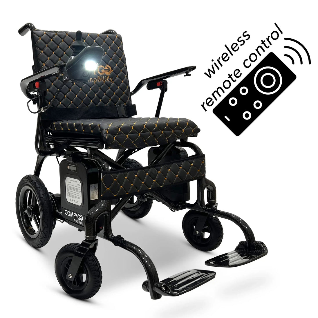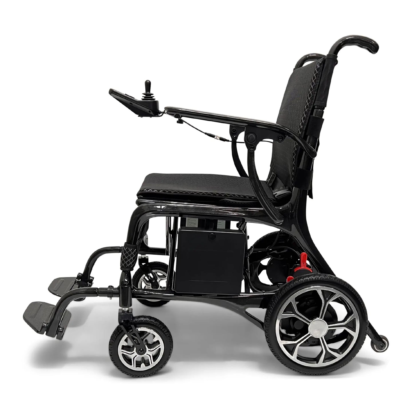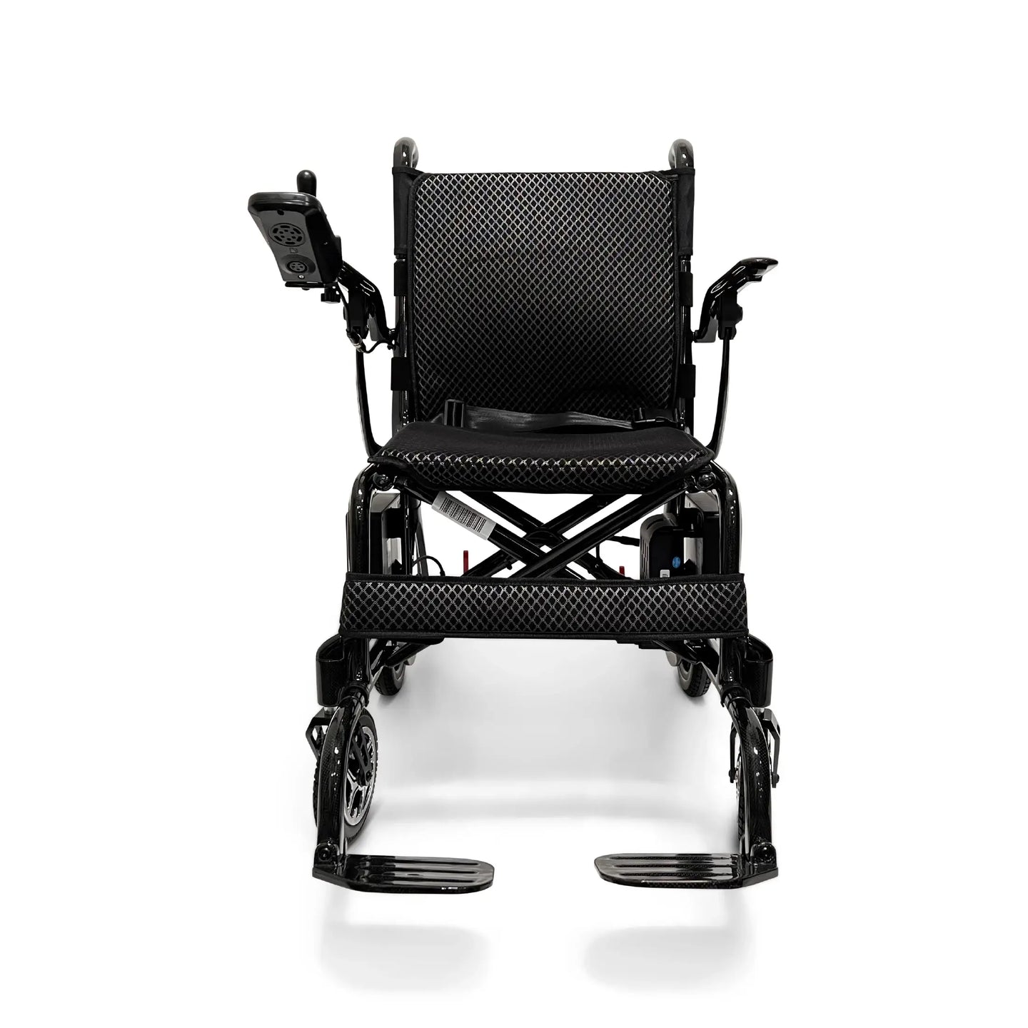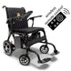 The ComfyGO Phoenix Carbon Fiber Wheelchair comes with two 6.6 AH lithium-ion batteries (standard) or two 10 AH batteries (long range). Both are quick-release, airline and cruise approved. Charging time is 6-8 hours with a standard 24V 2A charger included. The 10 AH battery requires a separate 24V 3A charger for faster charging.