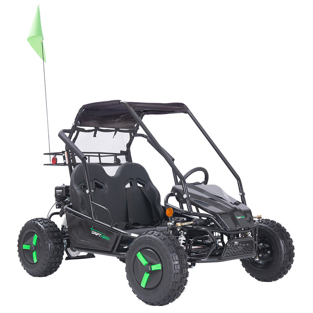 The adjustable dual seats provide the perfect fit for two riders, and the 4-point safety harnesses keep everyone secure while riding. Equipped with an LED light bar and rear tail light, this go kart is ready for both daytime adventures and evening rides. Perfect for youth riders and families, the Drift Hero DH1002 offers an unbeatable combination of power, control, and rugged off-road capability for the ultimate go karting experience.