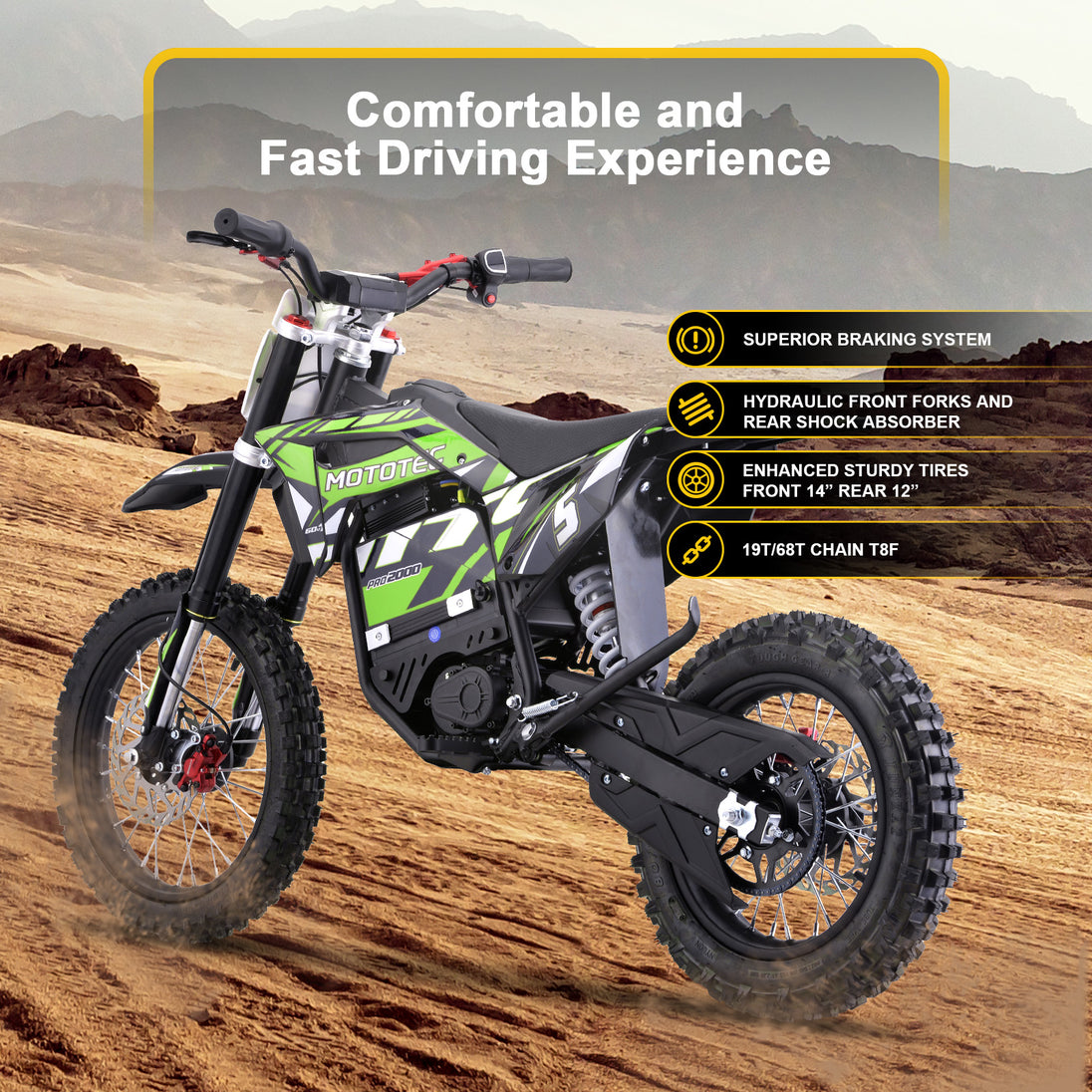 With front and rear hydraulic disc brakes, responsive suspension, and adjustable throttle response and top speed, this electric dirt bike ensures safe, smooth, and thrilling rides on all terrains.