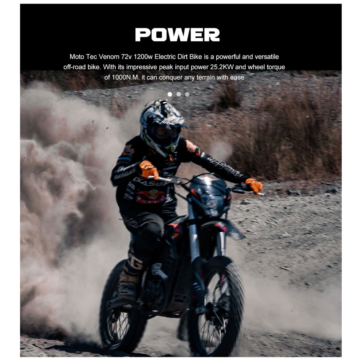Unleash extreme power with the MotoTec Venom 72v 12000w Electric Dirt Bike, Black. Built after 2 years of development, this high-performance electric dirt bike delivers up to 77 MPH top speed, making it perfect for racing, trails, and off-road adventures. Equipped with a 72v 50Ah lithium battery, it offers 4–5 hours of trail riding or 30 minutes of full-throttle racing.