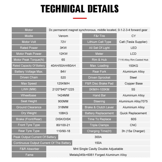 MotoTec Venom 72v 12000w 50Ah Electric Dirt Bike, Black - MT-Venom-72v-12000w_Black