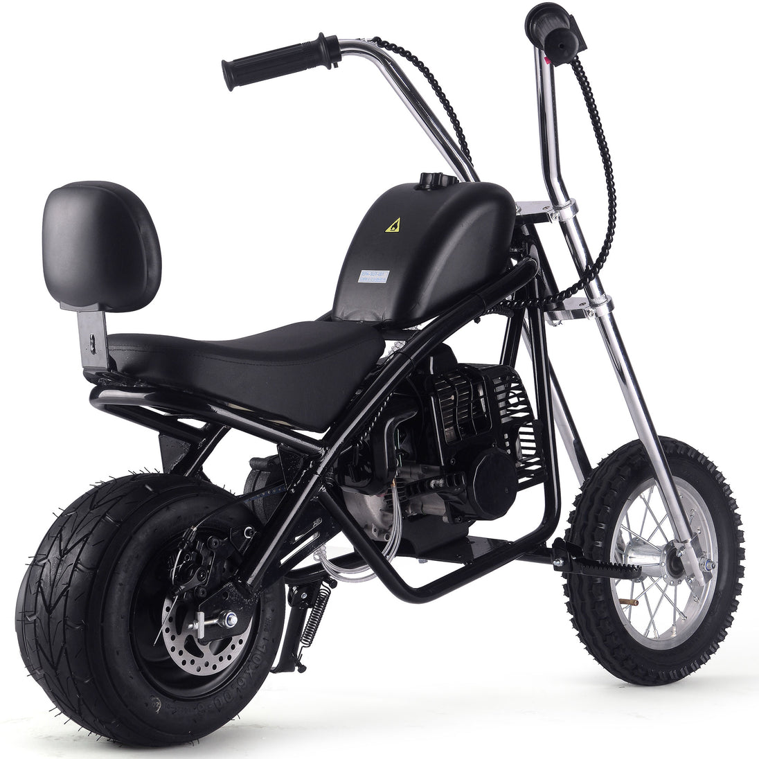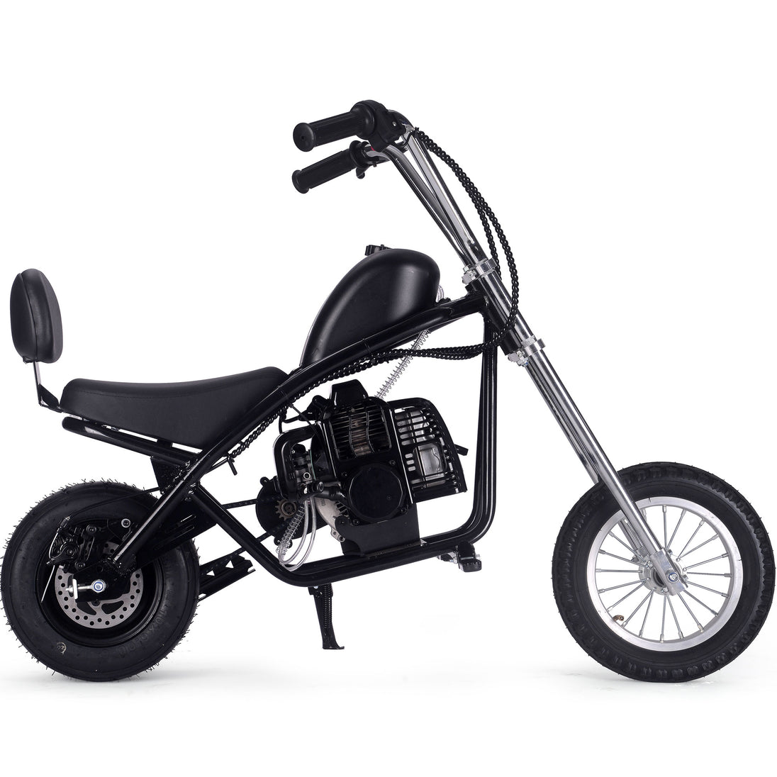 The MotoTec 49cc Gas Mini Chopper V2 Motorcycle is the ultimate ride for kids and teens who crave adventure and style! Powered by a reliable 49cc gas engine, this mini chopper delivers smooth performance for cruising around driveways, parking lots, or light trails. Its rear disc brakes provide safe stopping power, while the 12-inch front and 9-inch rear pneumatic street tires ensure stability and traction on a variety of surfaces. With its sleek chopper-style design and durable construction, the MotoTec Mini Chopper V2 combines safety, fun, and performance in one exciting package. Perfect for young riders ready to explore in style!