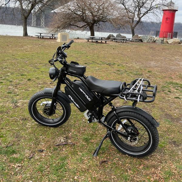 Powered by a strong 2000W motor, the HappyRun G70 handles hills and heavy loads effortlessly, supporting up to 330 lbs. The rear passenger seat can quickly convert into a cargo rack, transforming this electric cargo bike into a practical hauling solution for shopping, errands, or outdoor trips. Whether you’re riding with family or carrying supplies, the G70 combines power, flexibility, and convenience in one dependable electric bike.