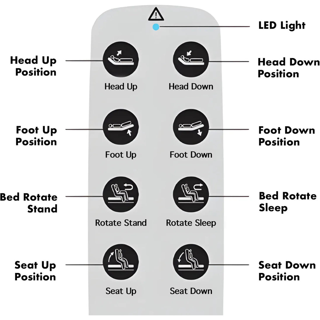 Easily switch between sleep, sit-up, chair, and lift positions—plus 90° rotation left or right for safer transfers. A simple remote gives you full control of comfort and mobility.