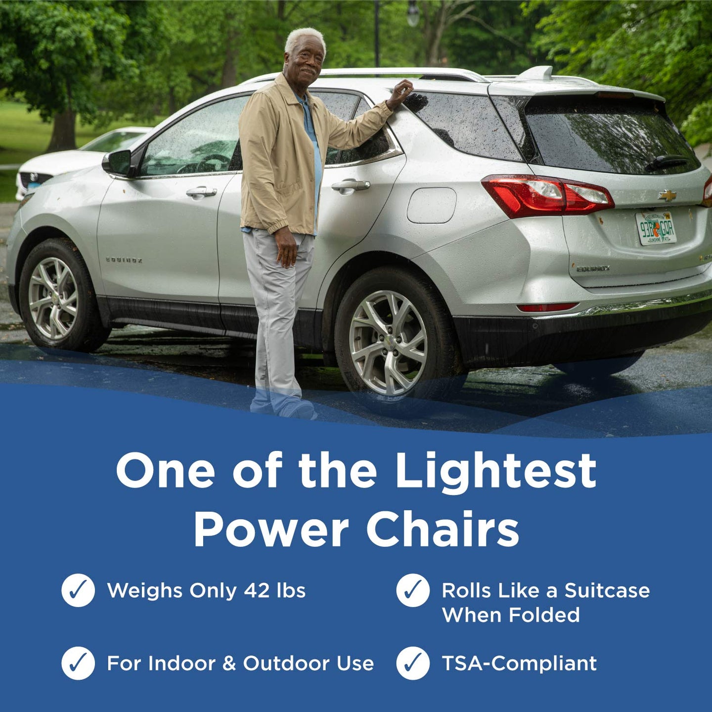 Weighing just 47 lbs. with the battery (42 lbs. without), the Zinger power chair folds flat in seconds and rolls like a suitcase. It’s FAA-approved and compact enough to fit in most car trunks—perfect for travel, errands, and on-the-go lifestyles.