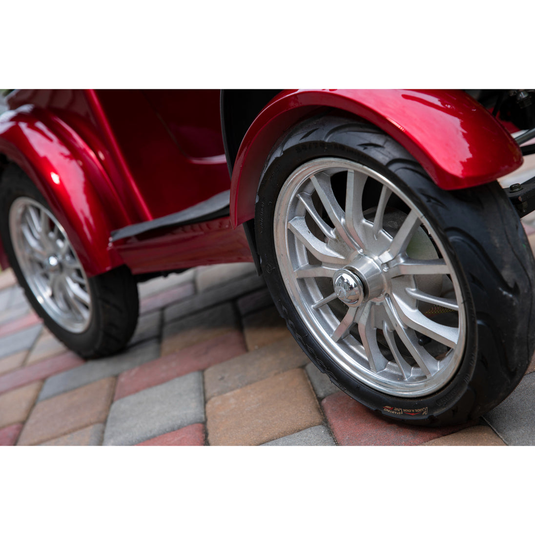 With an impressive 43-mile driving range on a single battery charge, the Red Elephant keeps you moving longer. It’s designed for tough terrains, featuring 14" front and 16" rear flat-free suspension tires and 6" of ground clearance to easily navigate gravel, grass, and uneven surfaces. Additional premium features include LED headlights, rear lights, turn signals, dual rearview mirrors, and a large rear storage basket. Batteries and charger are included, ensuring you're ready for adventure right out of the box.