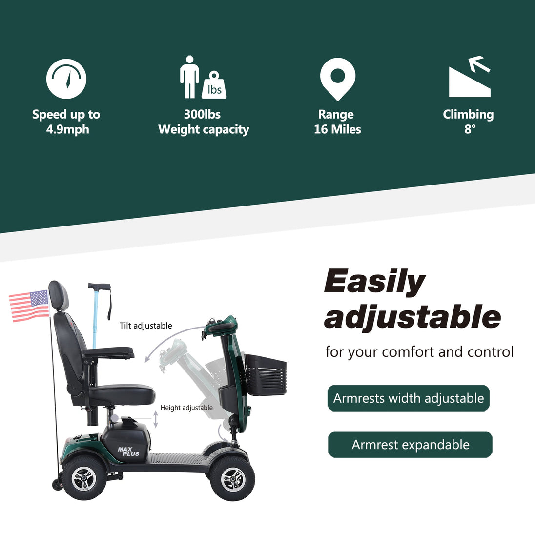 Experience premium performance and comfort with the Metro Mobility Max Plus 4-Wheel Mobility Scooter, a top-rated full-size mobility solution designed for extended use. Engineered with a powerful 300W motor, front and rear 9-inch pneumatic tires with aluminum alloy wheel hubs, and a rear suspension system, this scooter delivers a smooth and stable ride on various terrains. The Max Plus mobility scooter boasts a generous driving range of up to 16 miles and a weight capacity of 300 lbs, making it an excellent choice for all-day outings.