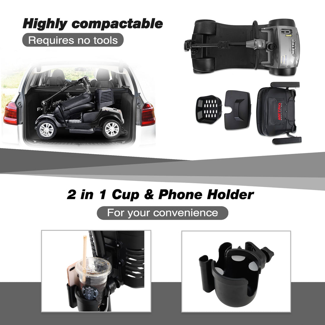 The sliding swivel seat with flip-up armrests enhances accessibility and comfort, while the intelligent electromagnetic brake system ensures safe and responsive stops. Featuring front and rear LED lights, a 2-in-1 cup and phone holder, and a simple fingertip control panel, this scooter prioritizes convenience and rider satisfaction. The Metro Mobility Max Sport is also designed for easy disassembly, making it perfect for transport and storage.