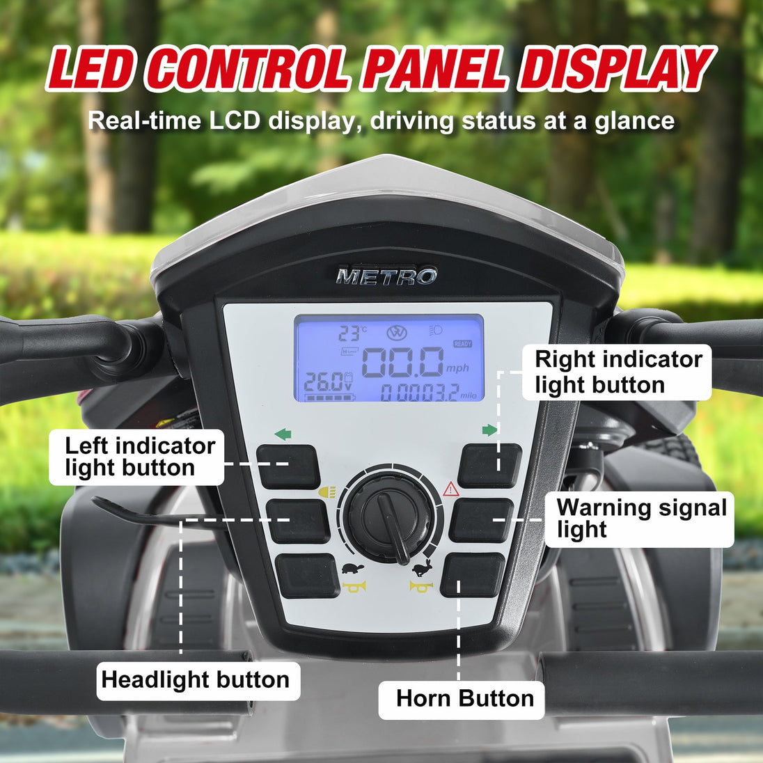 The Metro Mobility S500 Heavy-Duty 4-Wheel Mobility Scooter is engineered for riders who demand strength, comfort, and extended range. With a robust 350 lbs weight capacity and a powerful top speed of 8 mph, this full-size mobility scooter is ideal for outdoor use and long-distance rides, delivering an impressive driving range of up to 28 miles per charge. Designed with a comfortable, high-back seat with headrest, and 10-inch pneumatic tires on aluminum alloy wheels, it ensures a smooth, cushioned ride over various terrains.