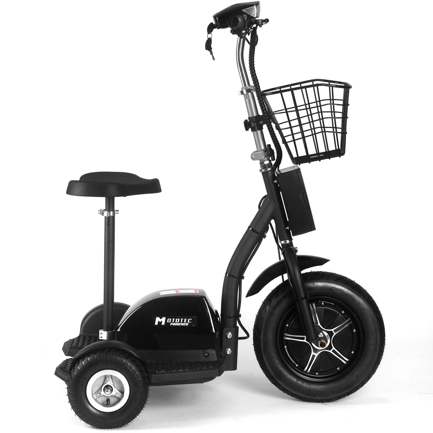 The MotoTec Electric Trike 48v 500w is a powerful three-wheel electric scooter designed for convenience, performance, and fun. Perfect for events, security, or warehouse use, this personal transporter offers the comfort of riding while sitting or standing. Powered by a 500-watt front hub motor, it reaches speeds up to 22 mph with a range of 20+ miles per charge.
