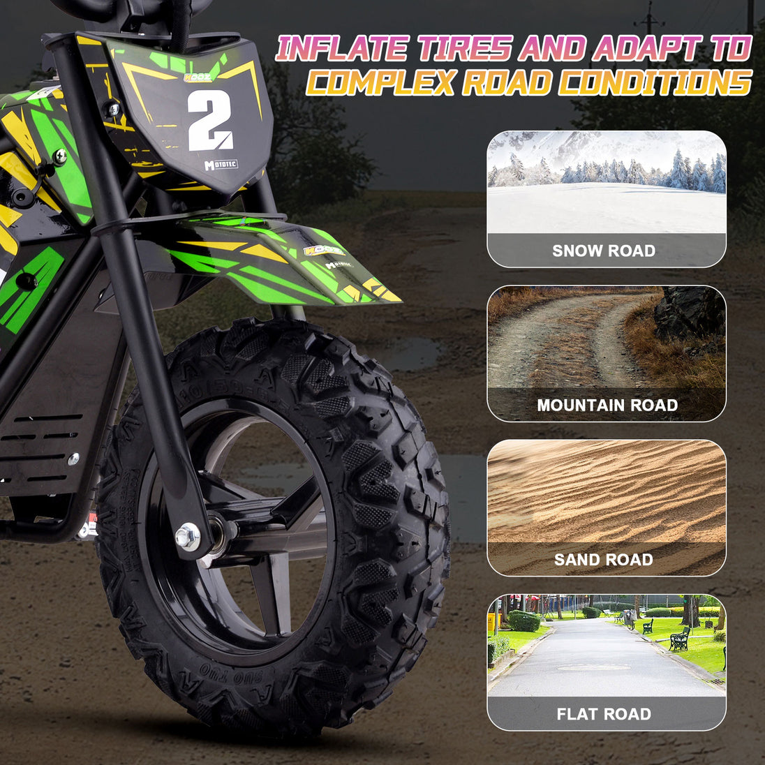 ✅ All-Terrain Knobby Tires – Improved grip and traction on dirt paths and uneven surfaces