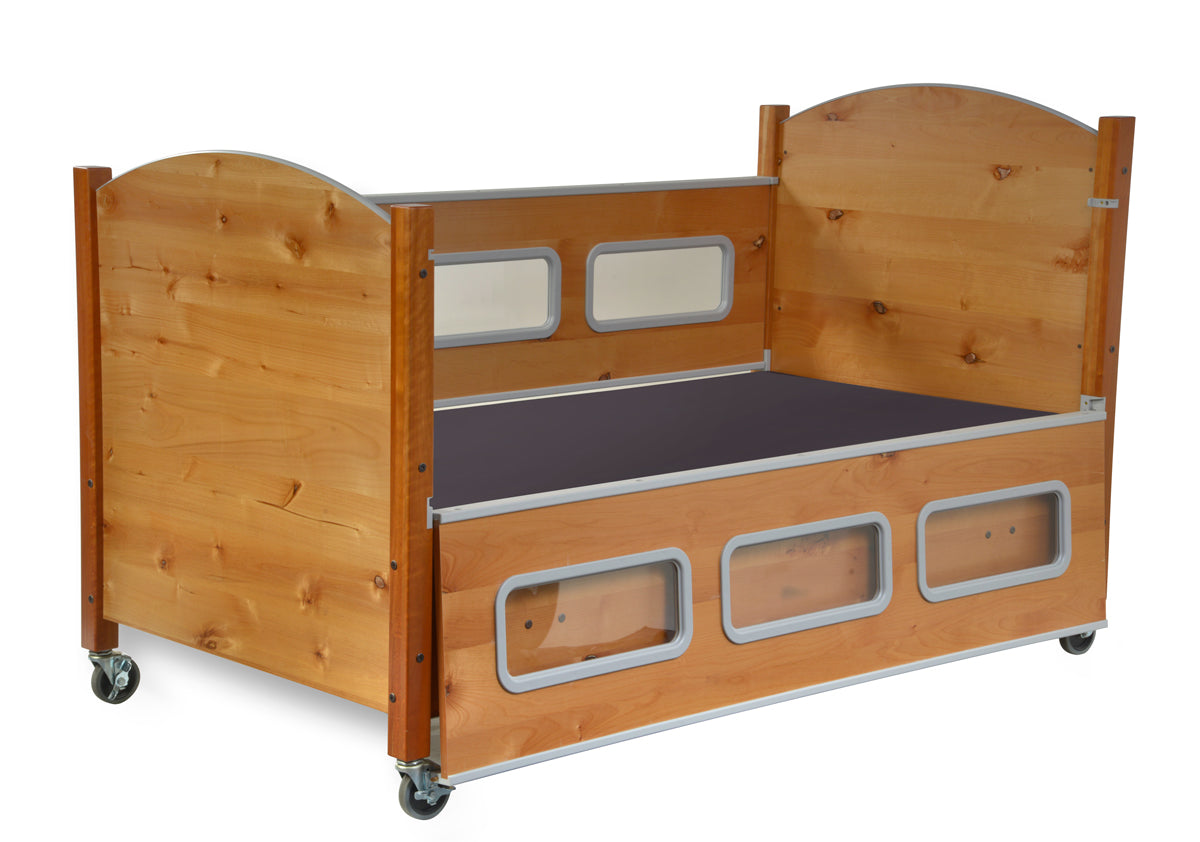 The Low SleepSafe Bed offers enclosed sides for fall prevention and adjustable height for easier transfers and caregiver access. Optional features include padded side rails, headboard or footboard windows, IV pole placement, and breathable, pressure-relief mattresses for added comfort and safety.