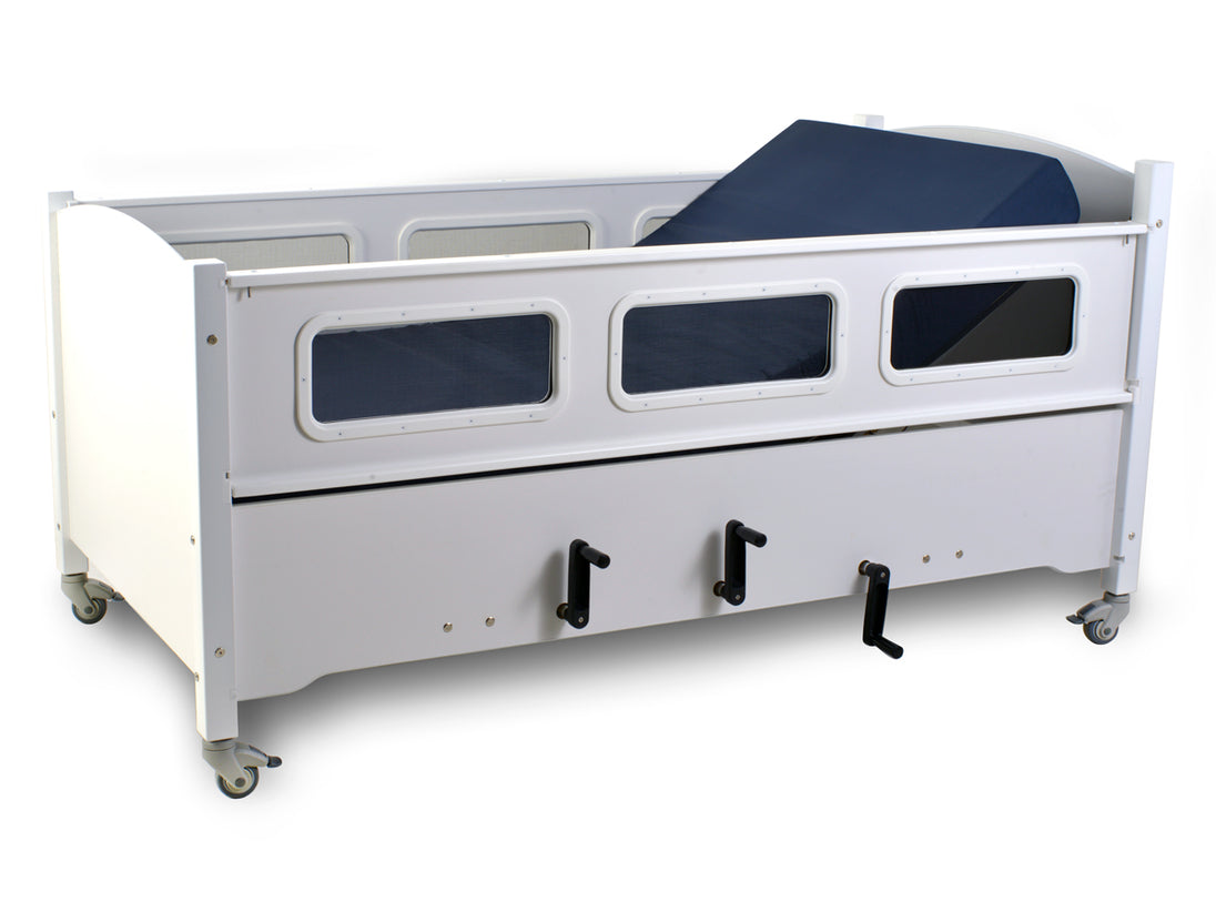 The Low SleepSafe Bed offers enclosed sides for fall prevention and adjustable height for easier transfers and caregiver access. Optional features include padded side rails, headboard or footboard windows, IV pole placement, and breathable, pressure-relief mattresses for added comfort and safety.
