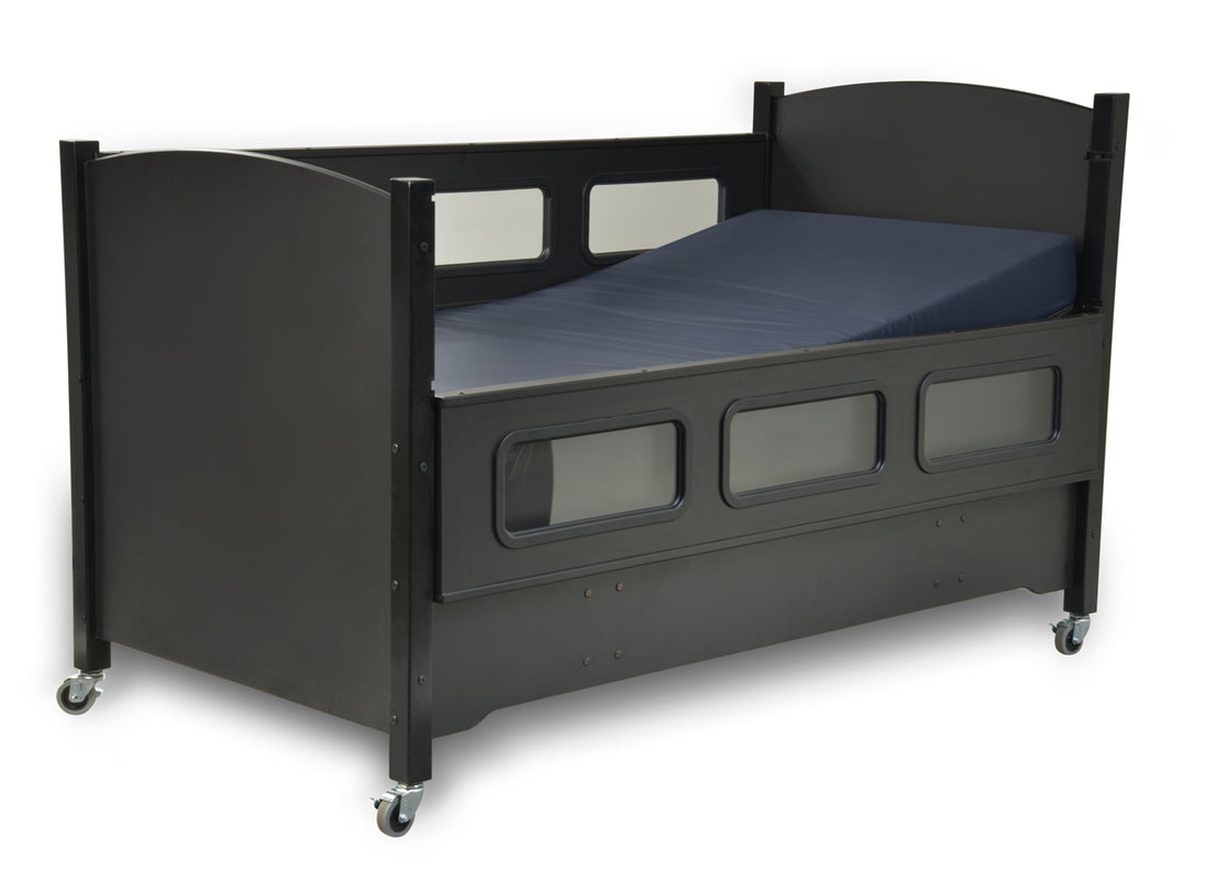 The SleepSafe II Medium Bed offers enclosed sides for fall protection and adjustable height for easier transfers and caregiver access. Optional features include padded side rails, IV pole, headboard/footboard windows, and breathable pressure-relief mattresses for added safety and comfort.