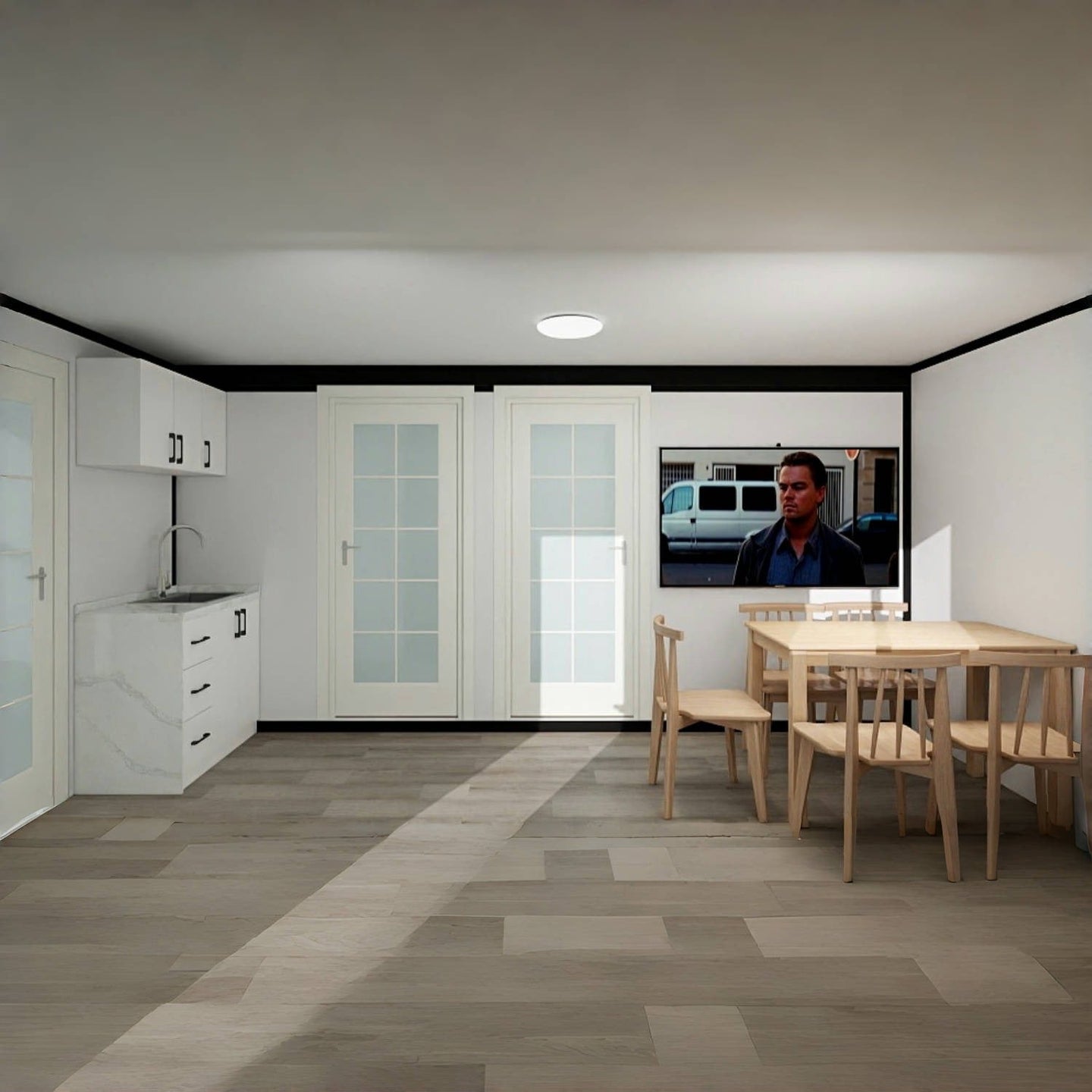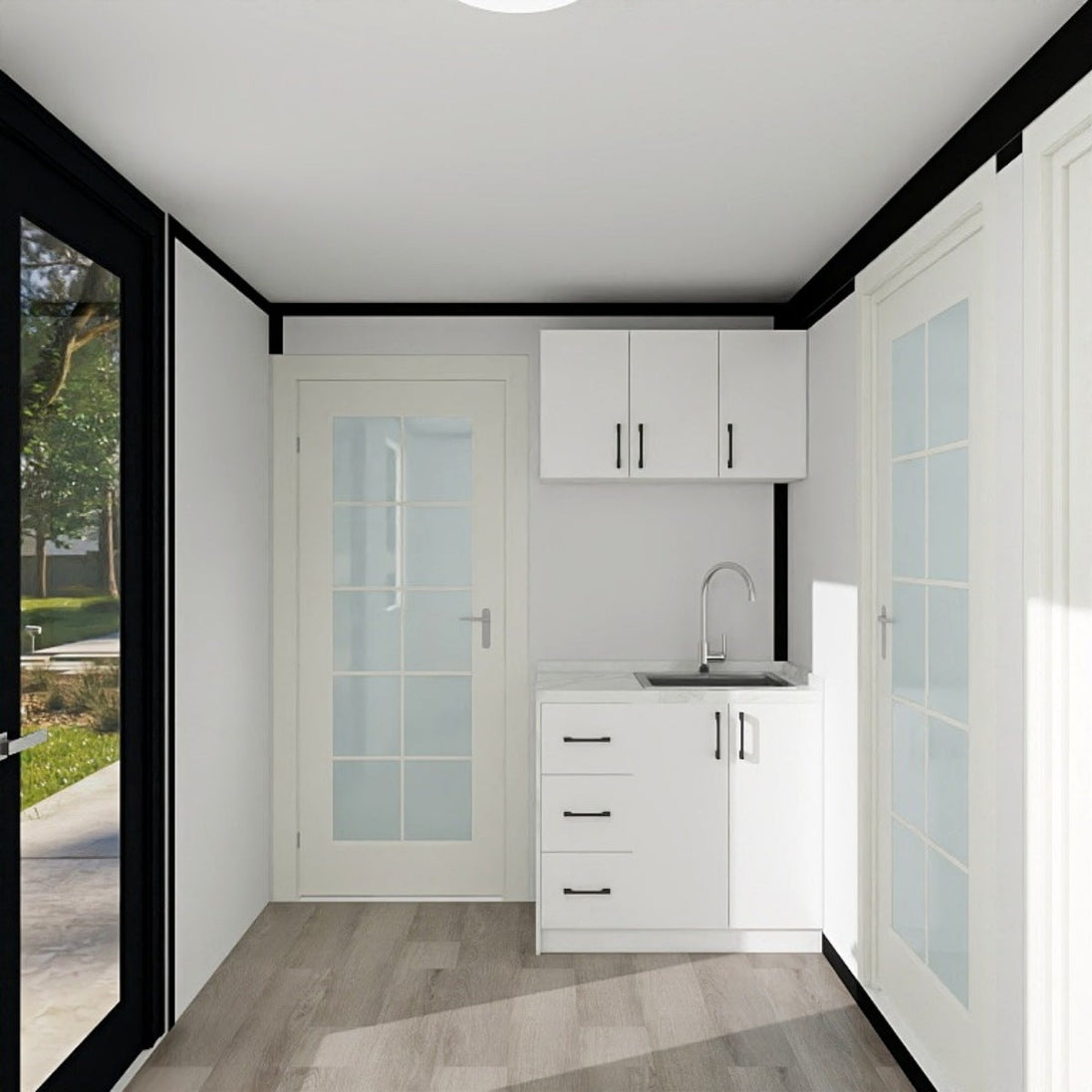 ✅ Complete Bathroom & Kitchenette – Features a shower bathroom and integrated kitchenette with cabinets, providing essential amenities for compact living.