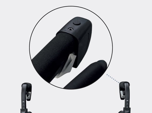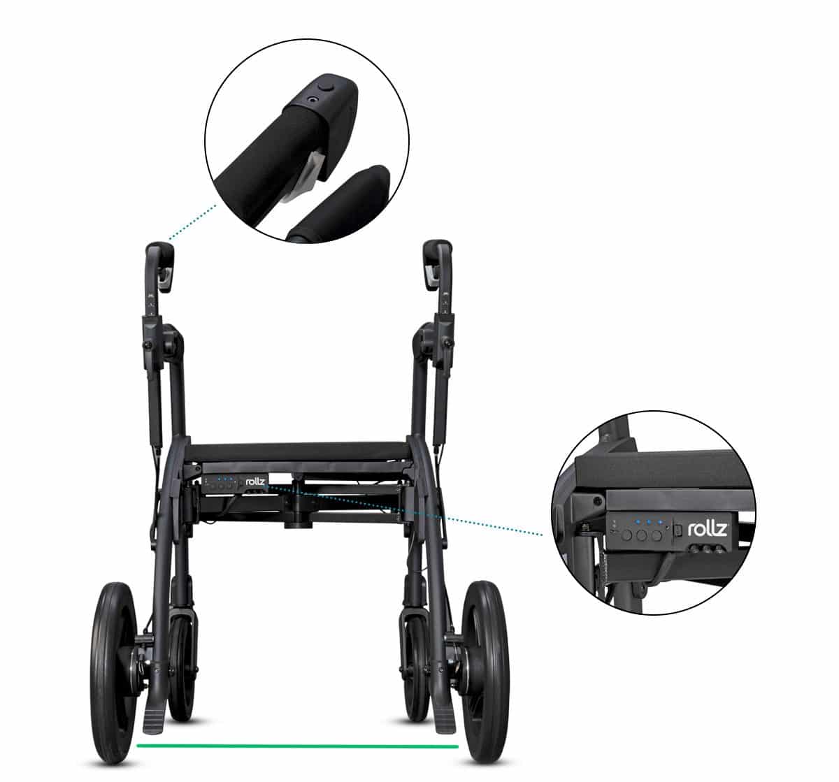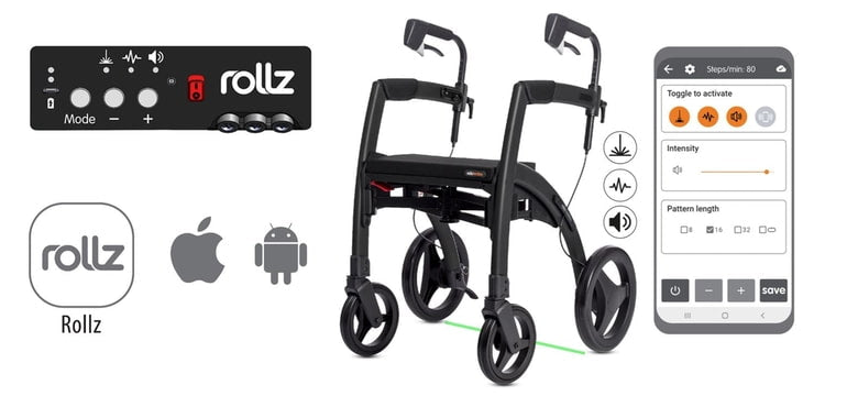 The laser cue projects a line on the ground to stimulate movement initiation, the metronome offers an auditory rhythm to follow, and the handlebar vibrations provide tactile feedback. Each cue can be individually adjusted using the built-in module or via the Rollz app, preventing user habituation and allowing for customized therapy based on personal needs.