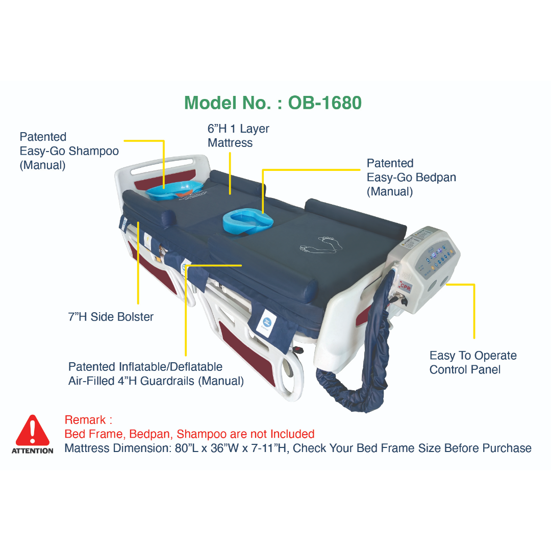 More than just a medical mattress, the OB-1650 is a comprehensive pressure ulcer prevention system. Often described as the “Rolls-Royce” of pressure relief mattresses, it provides optimized pressure redistribution, enhanced circulation support, and long-term durability. Ideal for hospitals, long-term care facilities, and home healthcare, the OB-1650 sets a new benchmark in pressure injury prevention and patient-centered care.