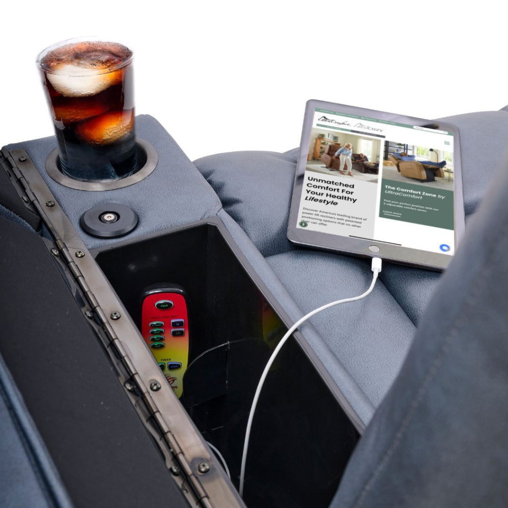 Experience luxury, innovation, and superior support with the UltraComfort Rhodes Medium Power Lift Recliner. Designed for maximum relaxation, this recliner features a plush, overstuffed seam back design, a cozy chaise pad, and four hinged arm panels that reveal multiple built-in conveniences. Whether you're looking for customized positioning, extra storage, or advanced comfort features, the Rhodes recliner is your perfect relaxation companion.
