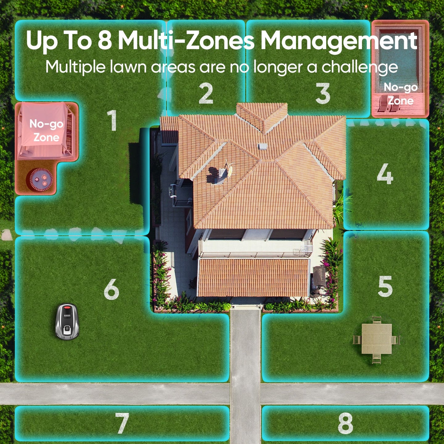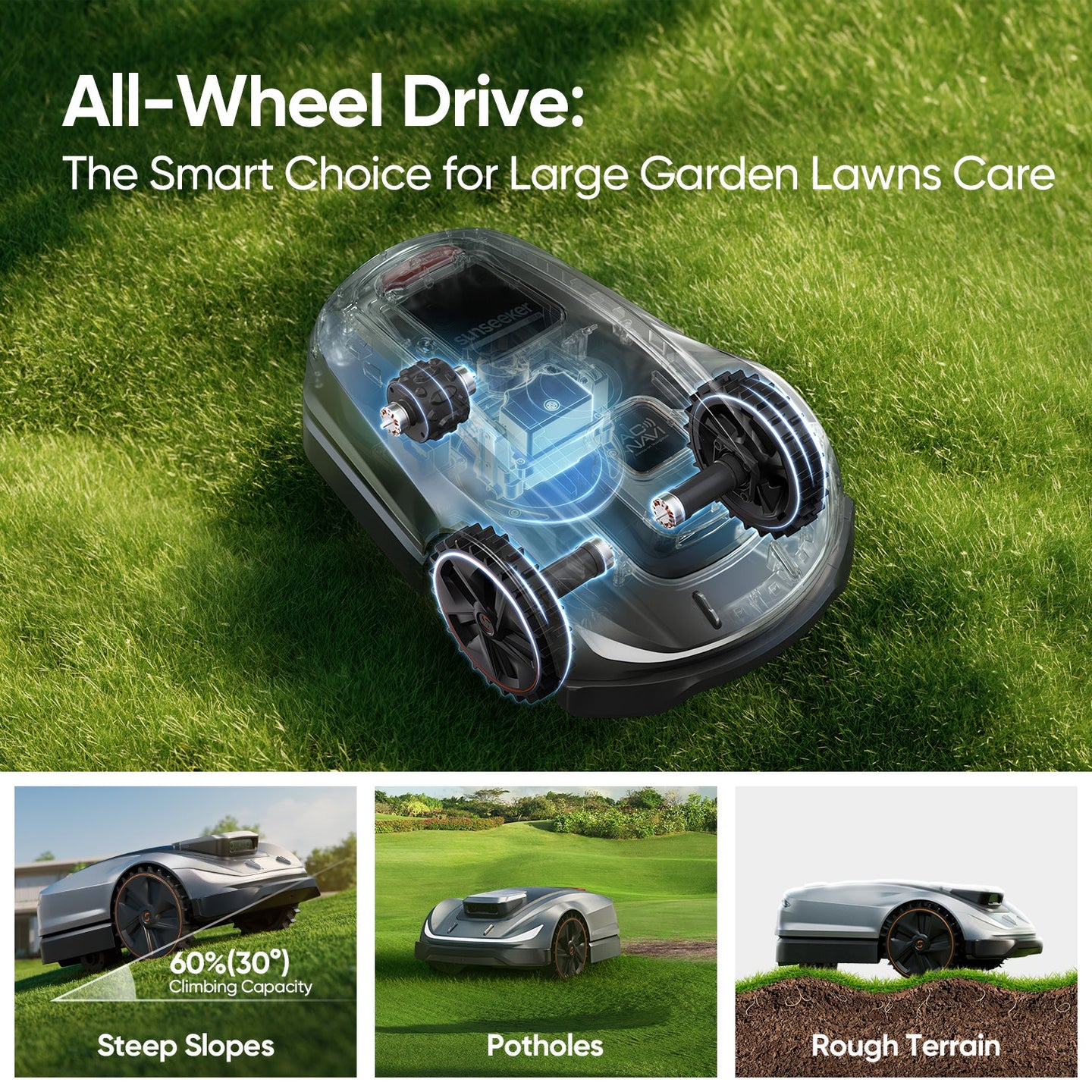 Wire-Free Setup – Enjoy hassle-free installation with virtual boundaries and multi-zone management, all controlled through the Sunseeker app.