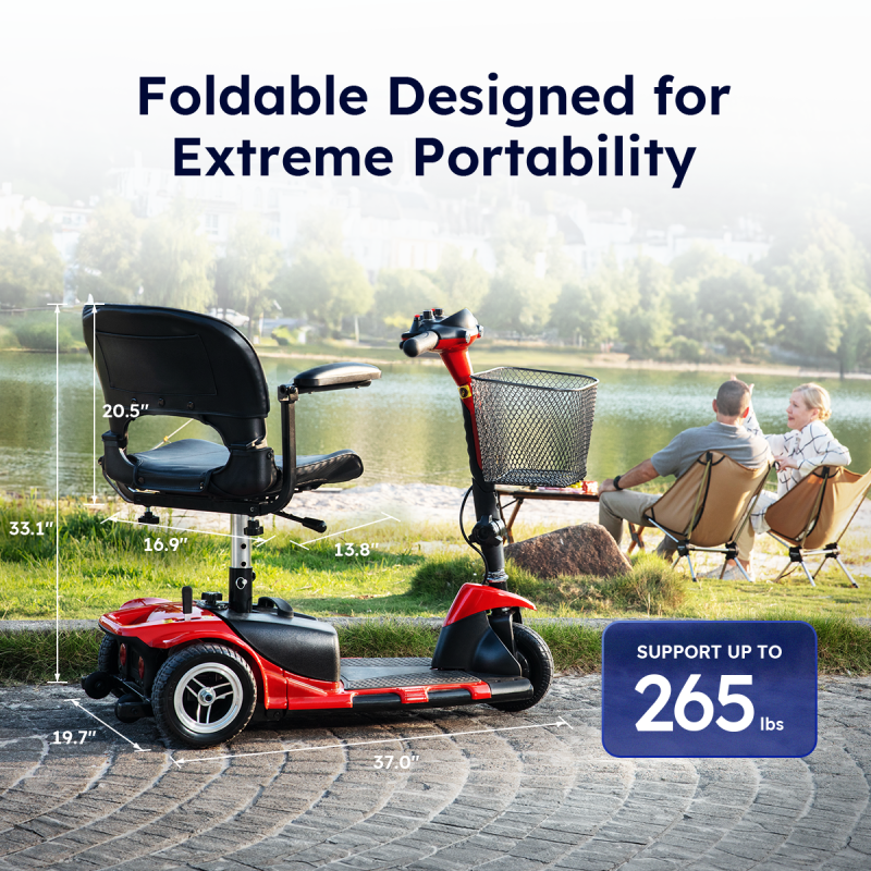 With a 9.3-mile drive range on a single charge, this scooter ensures you have the freedom to travel longer distances without worrying about battery life. It offers a 265 lbs weight capacity, making it suitable for a wide range of users. The scooter also comes equipped with a large, sturdy storage basket, perfect for carrying groceries, personal items, or other essentials on your journey.