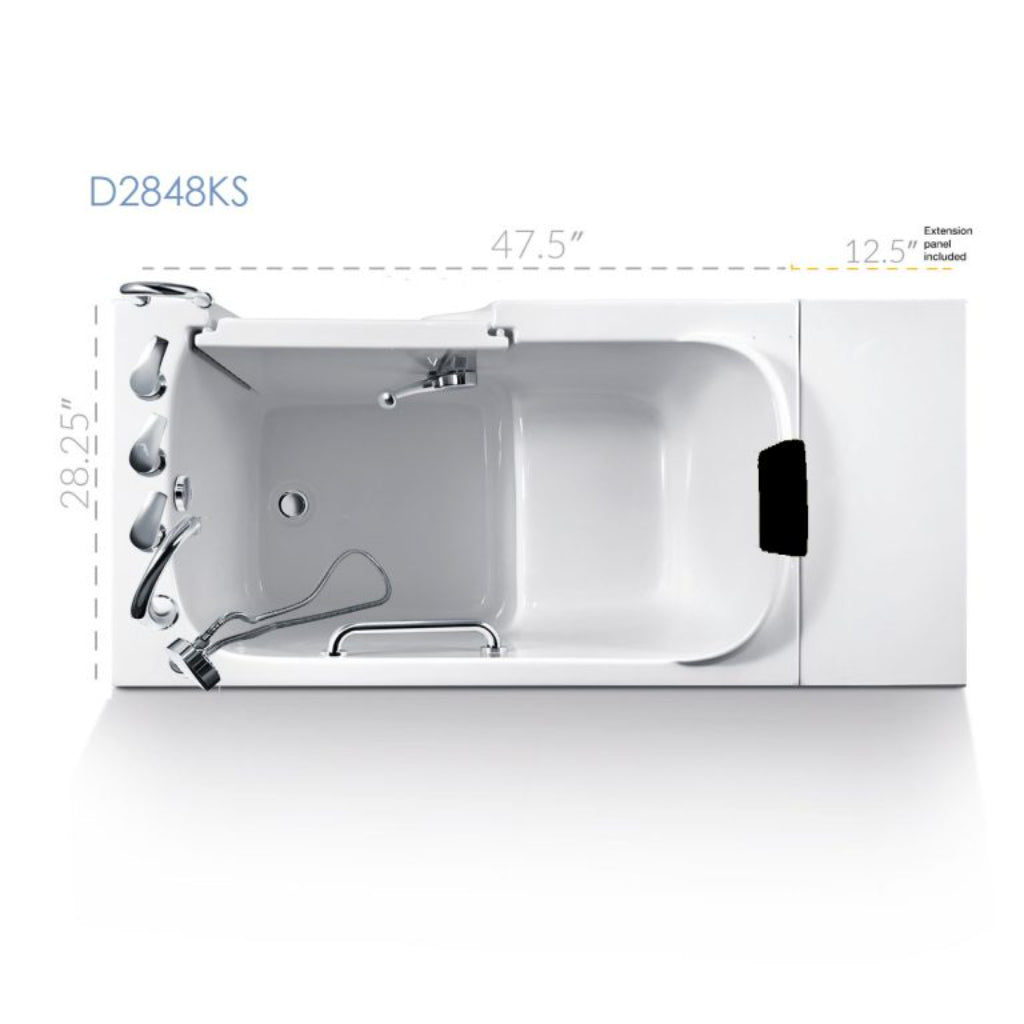 Despite its compact footprint, the D2848KS delivers exceptional comfort and accessibility, featuring a thoughtfully designed “knee-saver” curved door that makes closing the door from a seated position effortless. Regain your bathing independence with this ADA-compliant solution that combines practicality, style, and peace of mind in one elegant unit.